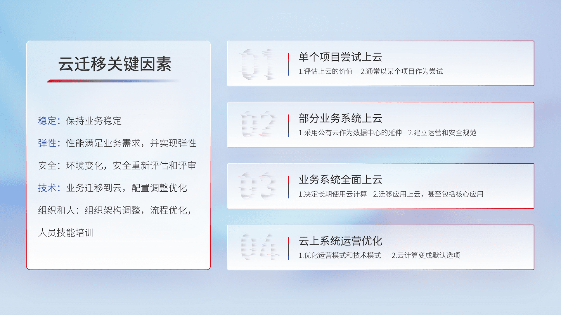 结合实际业务,,从规划设计、、云平台选型、、云原生改造、、数据迁移、、、集成交付,,,迁移全过程为客户识别最佳上云路径,,,,做好风险识别管理,,,设计网络架构、、、身份权限、、安全审计合规、、、、操作审计、、、日志审计、、、监控告警策略、、、多站点容灾设计等,,,,对云上基础设施进行整体规划,,,提升IT治理水平,,,,以满足弹性、、、、高可用、、高性能的需求。。。